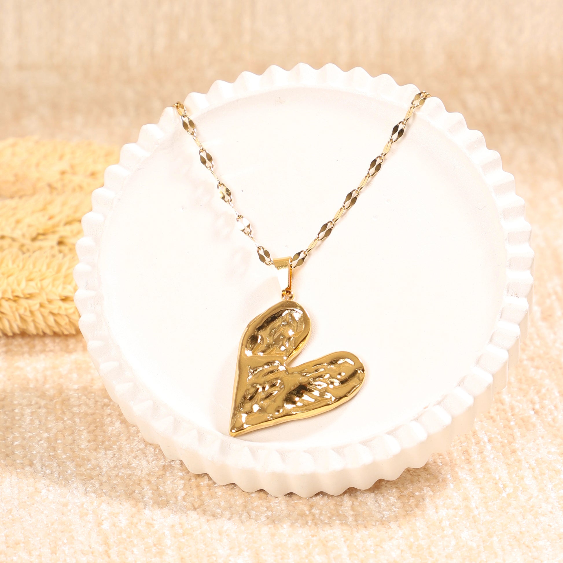 أضيفي لمسة عصرية وفنية إلى إطلالتك مع هذا العقد المميز. يتميز بتصميمه الذي يركز على قلادة بشكل قلب كبير، لكن بدلاً من السطح الأملس، يأتي بلمسة نهائية غير منتظمة ونافرة تعكس مظهرًا فريدًا وعصريًا. هذا التصميم يمنح القطعة طابعًا مختلفًا وجريئًا عن الأسلوب التقليدي، مما يجعلها قطعة مميزة تعبر عن شخصيتك.