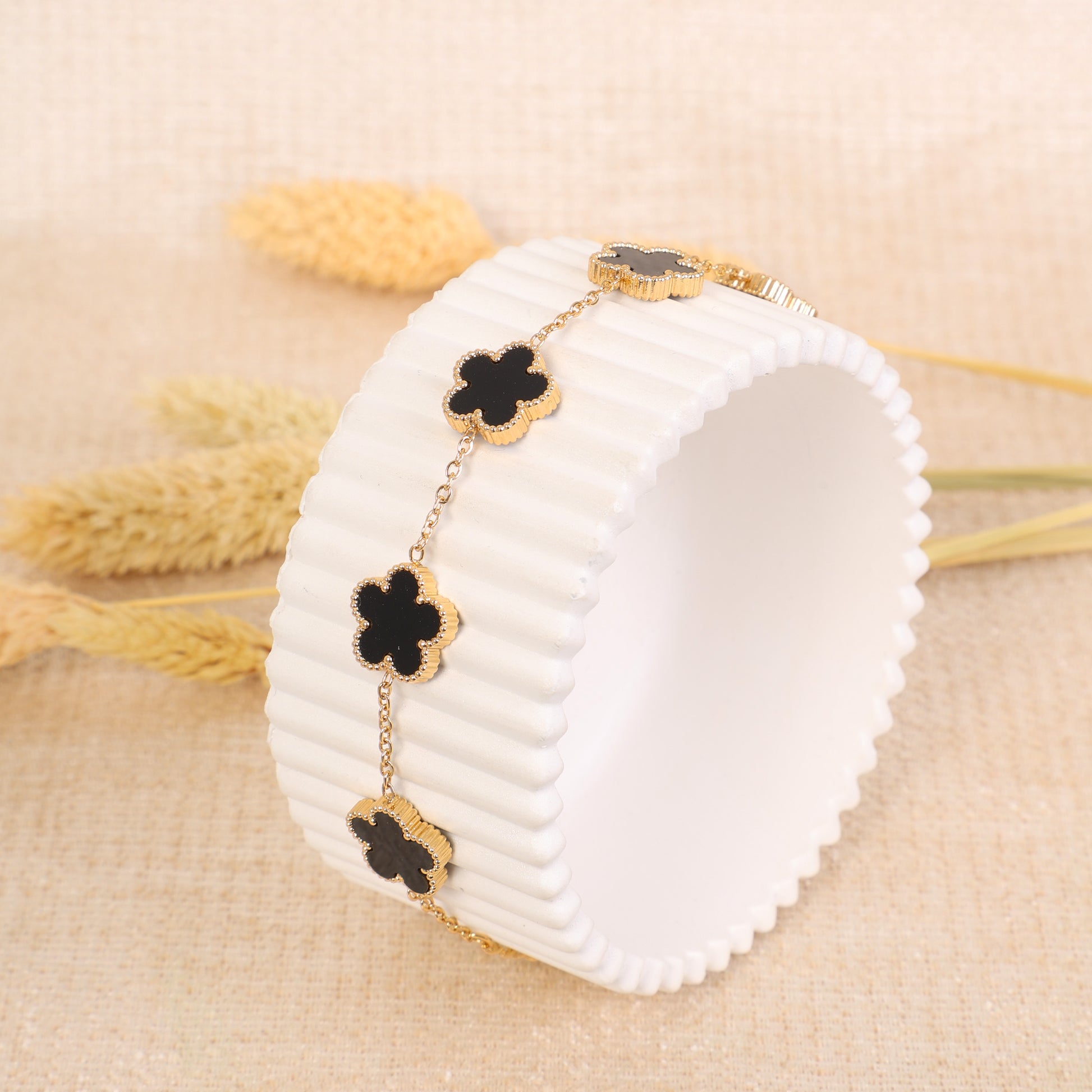 أضيفي لمسة من الأناقة الخالدة إلى معصمك مع هذا السوار الذهبي المستوحى من تصميمات "فان كليف" الأيقونية. يتميز بتصميمه الذي يجمع بين قلادات على شكل زهرة البرسيم الأنيقة، بلونها الأسود اللامع، مما يضفي عليه مظهراً راقياً وساحراً. هذا السوار هو قطعة مثالية لتنسيقها مع أي إطلالة، من الكاجوال إلى الرسمي.