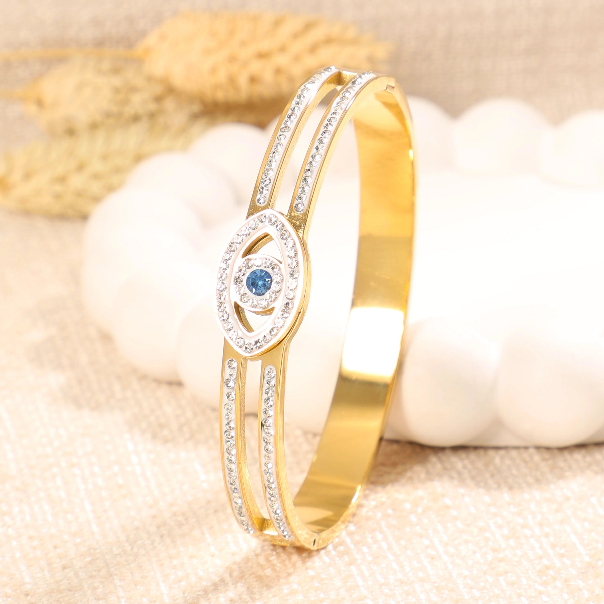 أضف لمسة من الفخامة والحماية إلى إطلالتك مع هذه الأسوارة الجذابة المصممة بشكل عين الحسد، والمزينة بكريستالات لامعة. تتميز بتصميمها العصري والأنيق، حيث تتوسطها عين الحسد باللون الأزرق الفاتح، ومحاطة بصفين من الكريستال الأبيض المتلألئ، مما يضفي عليها لمسة من البريق والسحر.