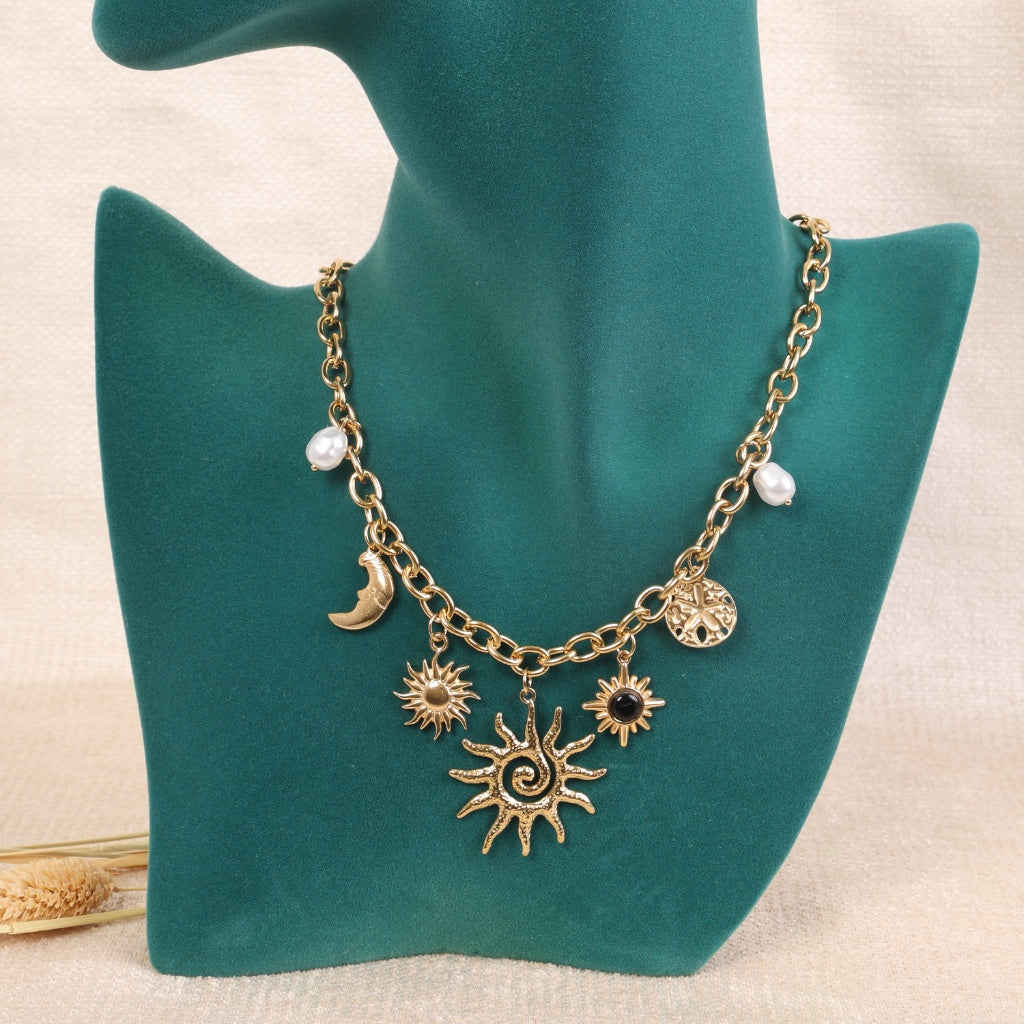 انطلقي في رحلة عبر سحر الكون مع هذه القلادة الذهبية الفريدة. يتميز تصميمها الجريء بتعدد الطبقات والقلادات، حيث تتدلى من سلسلة معدنية سميكة مجموعة متنوعة من الرموز الكونية: الشمس اللامعة، القمر الهادئ، النجوم، وحبات اللؤلؤ الأبيض. تتوسطها شمس كبيرة بتصميم لولبي، مما يجعلها قطعة فنية آسرة تعبر عن شخصية قوية ومحبة للتجديد.