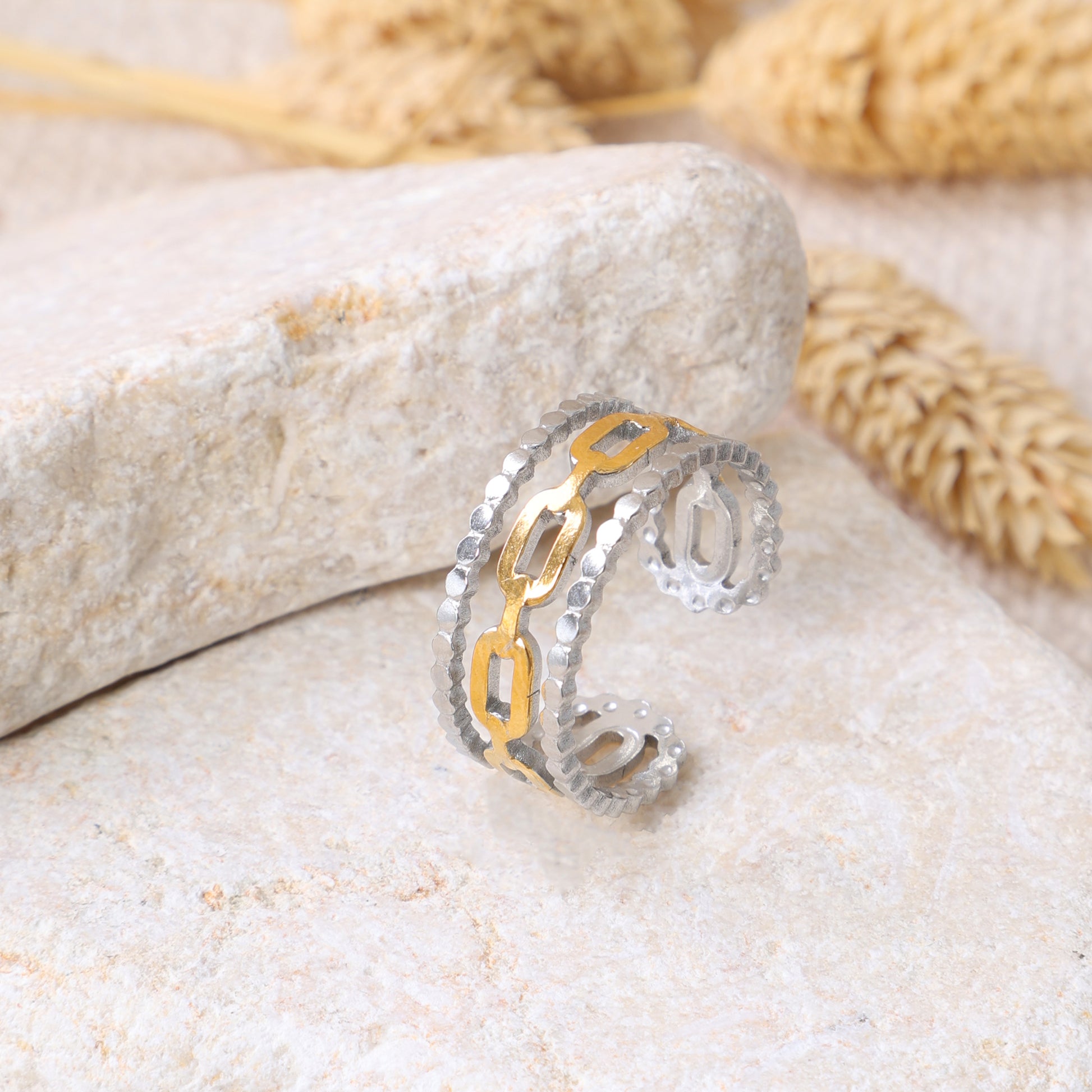 أضيفي لمسة من الأناقة العصرية إلى يديك مع هذا الخاتم الفريد الذي يجمع بين اللونين الذهبي والفضي. يتميز بتصميمه الذي يلتف حول الإصبع، مكوناً من أشرطة معدنية متداخلة بشكل هندسي، مع شريط ذهبي لامع يضيف عليه لمسة من البريق. هذا الخاتم هو قطعة مميزة تعبر عن شخصيتك المحبة للتجديد والجمال.