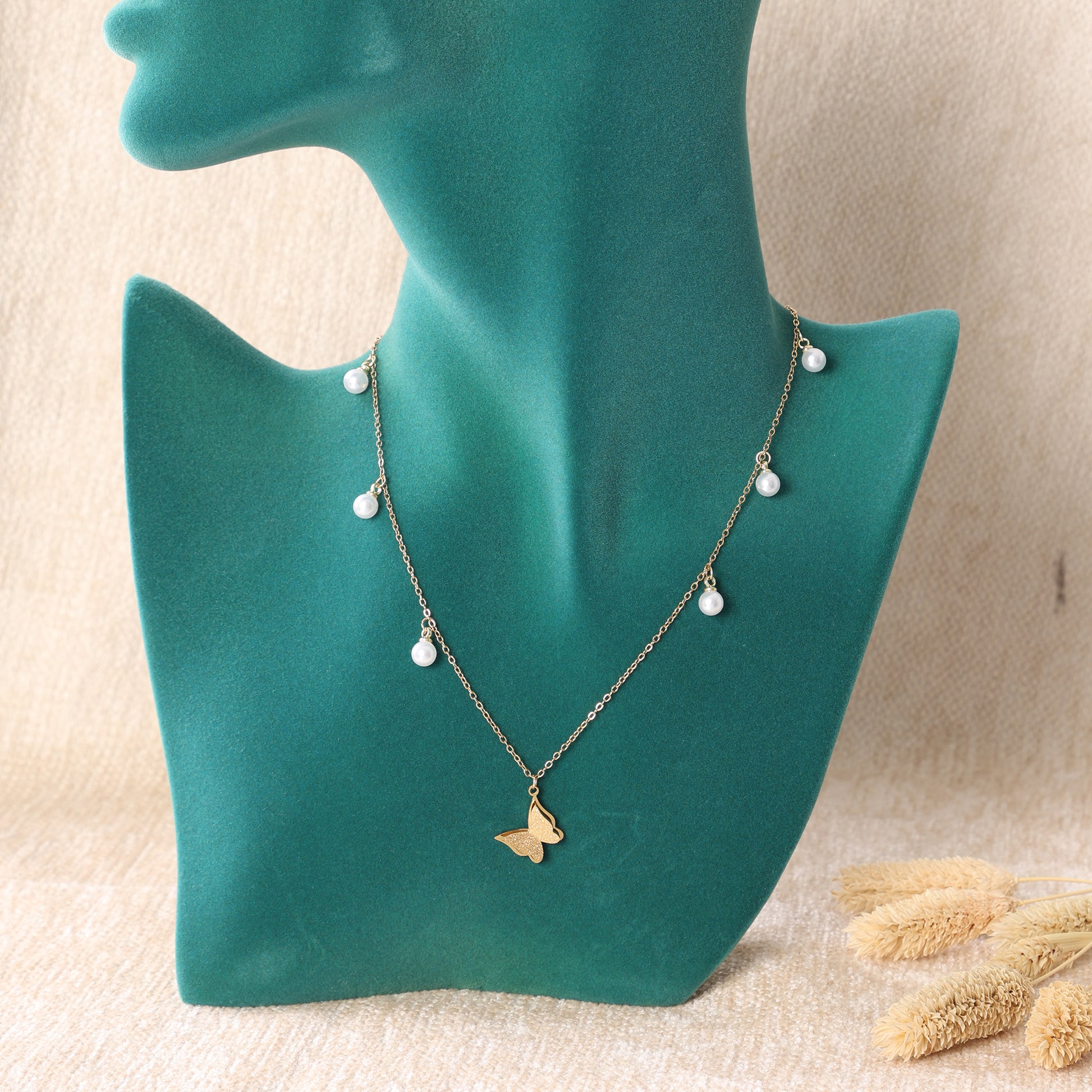 أضيفي لمسة من الأناقة والأنوثة إلى إطلالتك مع هذا العقد الذهبي الفريد. يتميز بتصميمه الذي يجمع بين سحر الفراشة وجمال اللؤلؤ، حيث تتوسطه قلادة على شكل فراشة ذهبية، وتتزين السلسلة بقطع صغيرة من اللؤلؤ المتناثر، مما يضفي عليه مظهراً حالماً وناعماً. هذه القلادة هي قطعة مثالية تعبر عن الرقة والجمال بأسلوب أنيق.