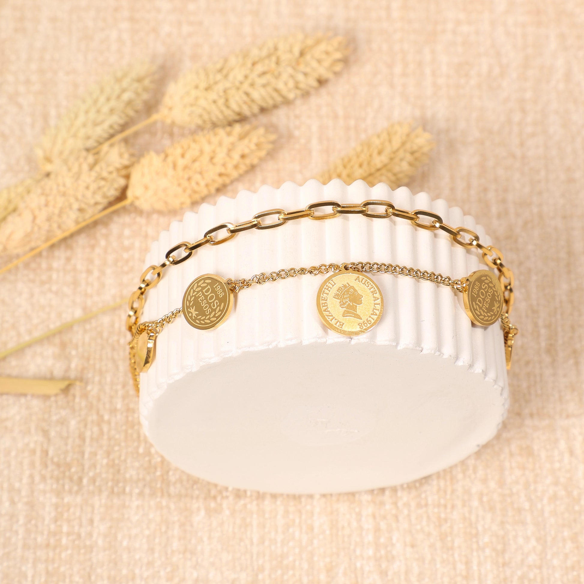 تميزي بأسلوب كلاسيكي وعصري في آن واحد مع هذا الانسيال الجذاب. يتميز بتصميمه الذي يجمع بين سلسلتين، إحداهما بتصميم "كوبي تشين" الأنيق، والأخرى سلسلة ناعمة تحمل قلادات مستديرة على شكل عملات معدنية قديمة. هذه التفاصيل الفريدة تمنحه مظهراً جريئاً وأنيقاً، يناسب جميع الإطلالات.