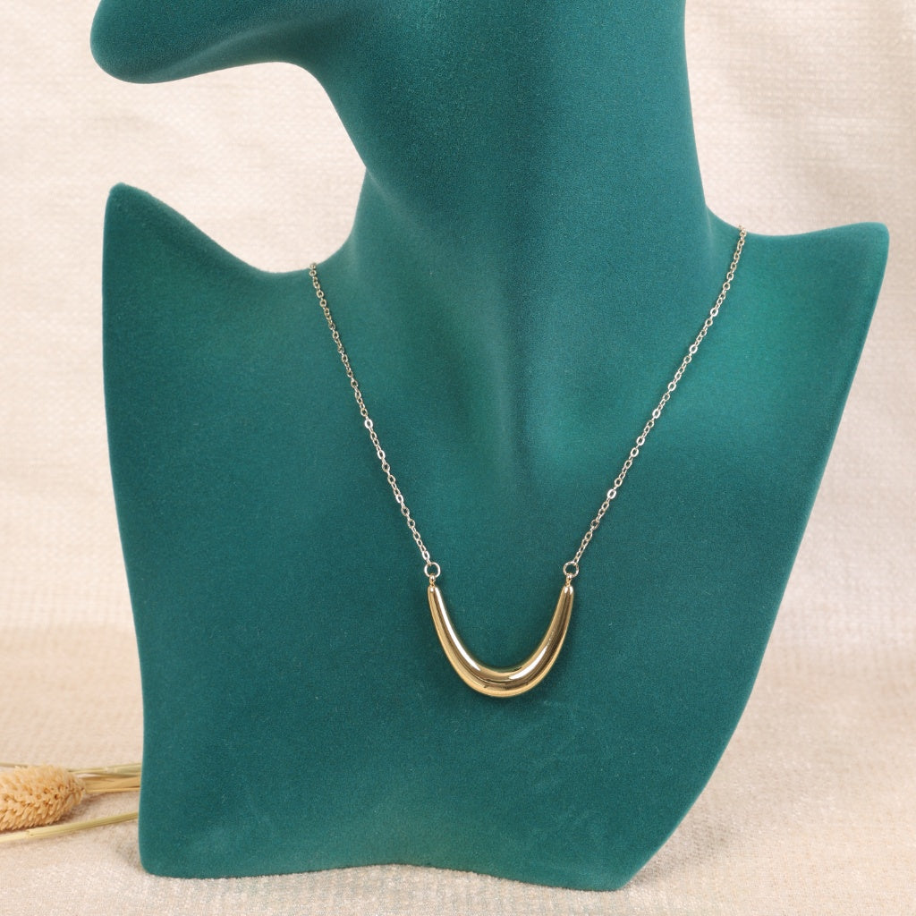 أضيفي لمسة من الأناقة العصرية إلى إطلالتك مع هذا العقد الذهبي الفريد. يتميز بتصميمه الذي يركز على قلادة على شكل هلال مصقول ولامع، تتدلى من سلسلة رقيقة. هذا العقد هو قطعة مميزة تعكس شخصيتك المحبة للجمال البسيط والراقي.
