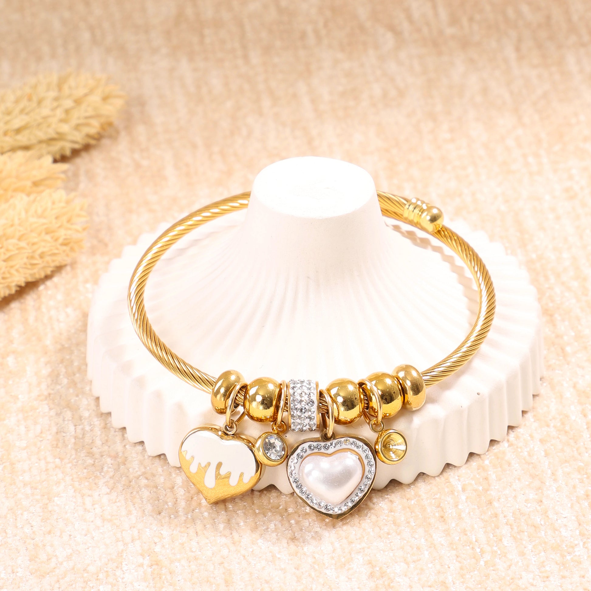 أضيفي لمسة من الأنوثة والدفء إلى معصمك مع هذا الانسيال الساحر. يتميز بتصميمه الذي يجمع بين عناصر مختلفة بأسلوب متناغم: سلك معدني رفيع، حبيبات ذهبية لامعة، وقلادات متدلية على شكل قلوب. وتبرز قلادتان على شكل قلب، إحداهما بتصميم أبيض وذهبي فريد، والأخرى بقلب أبيض ناعم محاط بالكريستال اللامع، مما يضفي عليها مظهراً رومانسياً لا مثيل له.