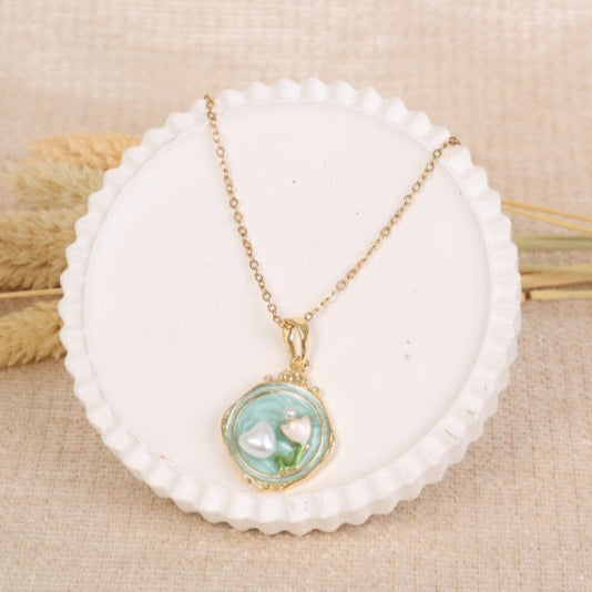 أضيفي لمسة من الأناقة الرومانسية إلى إطلالتك مع هذا العقد الذهبي الساحر. يتميز بتصميمه الذي يركز على قلادة دائرية مزخرفة، تحمل بداخلها رسم لأوزتين أبيضتين تسبحان في بحيرة زرقاء هادئة. هذا العقد هو قطعة فنية بحد ذاتها، تعبر عن الحب والجمال الطبيعي بأسلوب راقٍ.