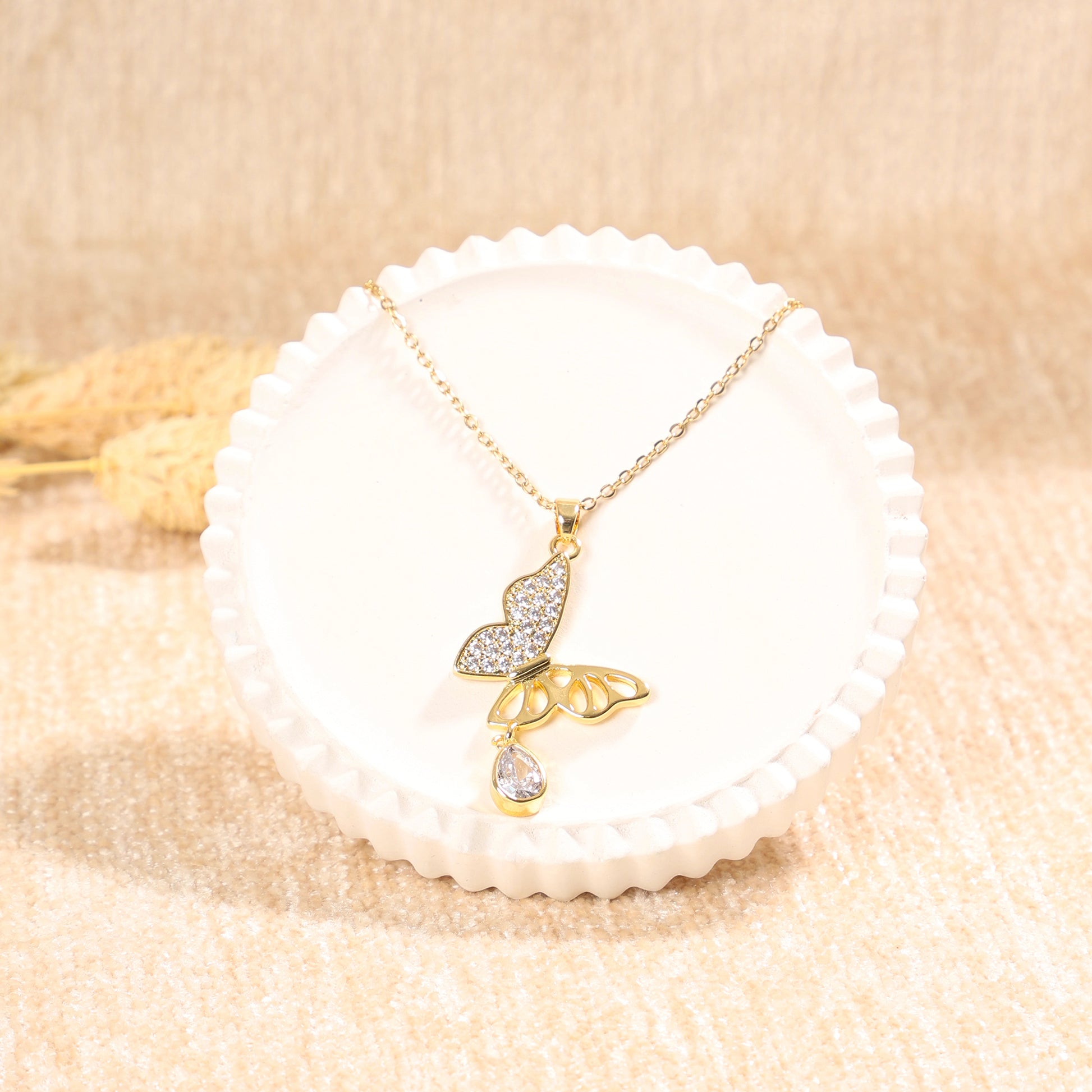 انثري سحراً ورقةً في إطلالتك مع هذا العقد الفريد، المصمم ليحاكي جمال الفراشات. يتميز العقد بقلادة على شكل فراشة ذهبية، حيث تتلألأ إحدى جناحيها بالكريستال اللامع، فيما يعكس الجناح الآخر أناقة التصميم المعدني المصقول. وتكتمل روعة القلادة بوجود حجر كريستال متدلي يضيف لمسة من البريق الساحر مع كل حركة.