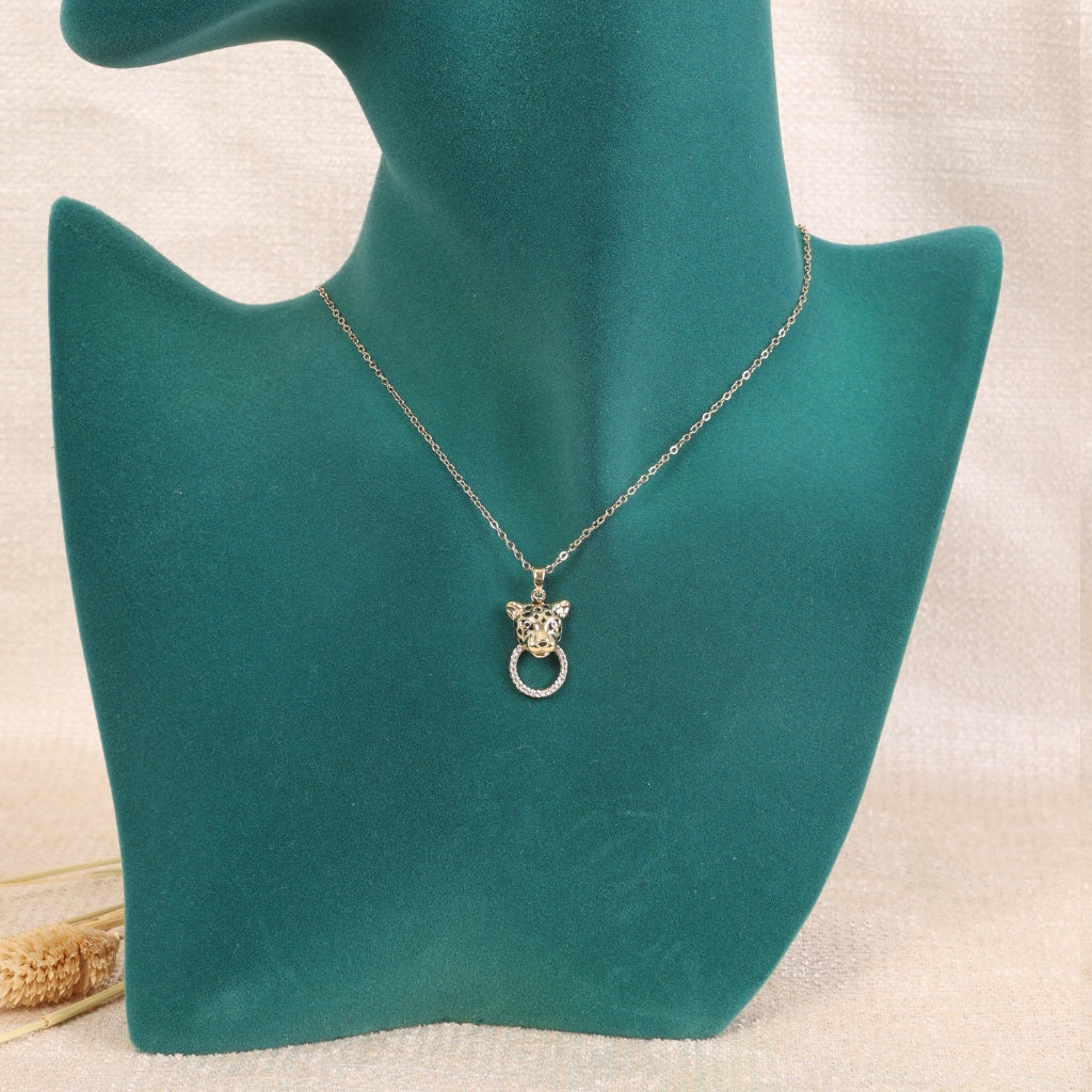 أضيفي لمسة من الجرأة والأناقة إلى إطلالتك مع هذا العقد الفريد. يتميز بتصميمه الذي يجسد رأس نمر بانثر، وهو رمز للقوة والجمال. يتزين رأس النمر بالكريستال اللامع، وتتدلى منه حلقة مرصعة بالكامل بالكريستال، مما يضفي عليه بريقاً ساحراً. هذه القلادة هي قطعة مثالية تعبر عن شخصيتك القوية والمميزة.