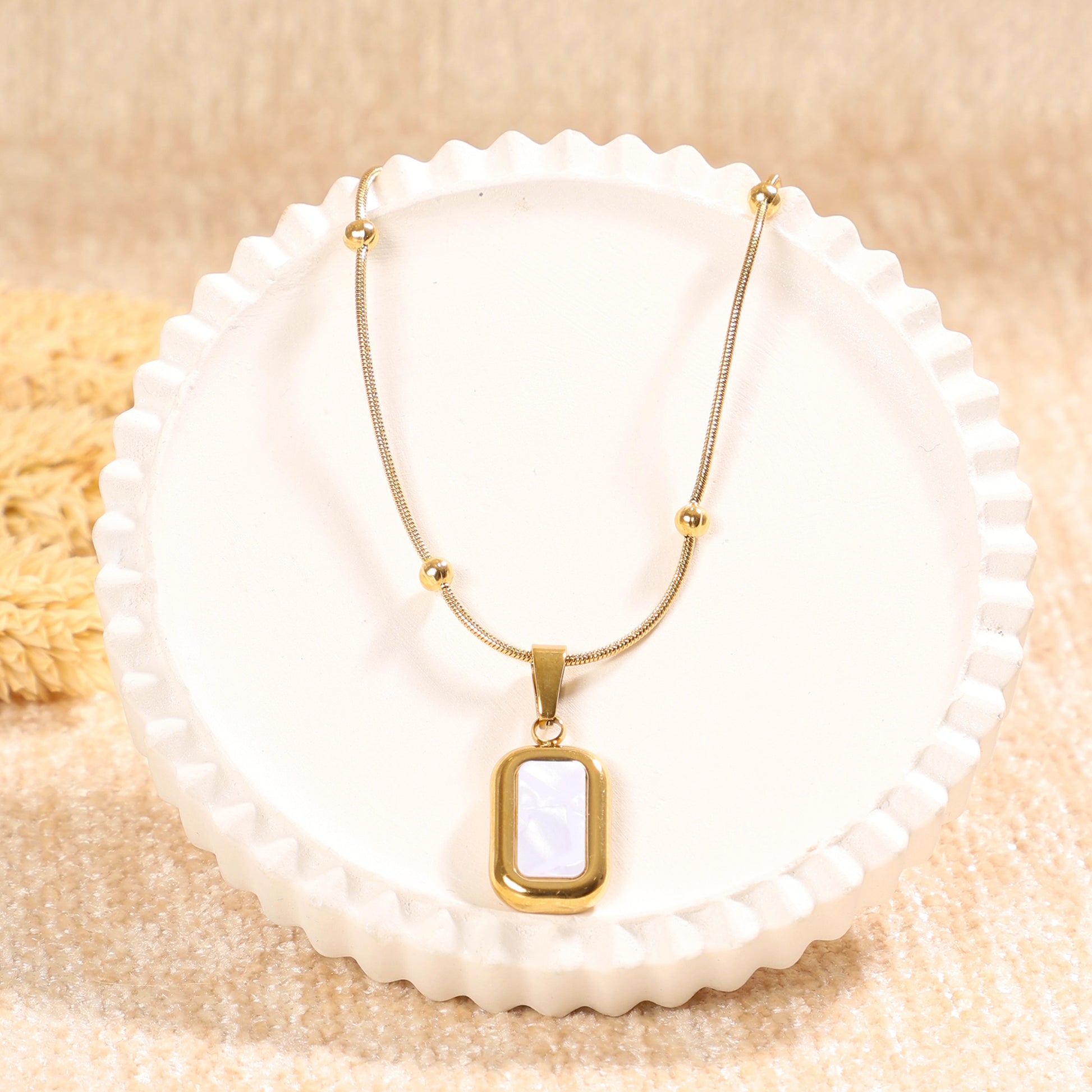 اجعلي إطلالتك تعكس الأناقة والهدوء مع هذا العقد العصري. يتميز العقد بقلادة على شكل مستطيل ذهبي مصقول، يتوسطه قطعة ناعمة من الصدف الأبيض اللامع، مما يخلق تبايناً جميلاً بين اللونين. كما تبرز تفاصيل السلسلة الأنيقة بوجود حبيبات ذهبية متناثرة على طولها، لتضيف لمسة من الجاذبية.