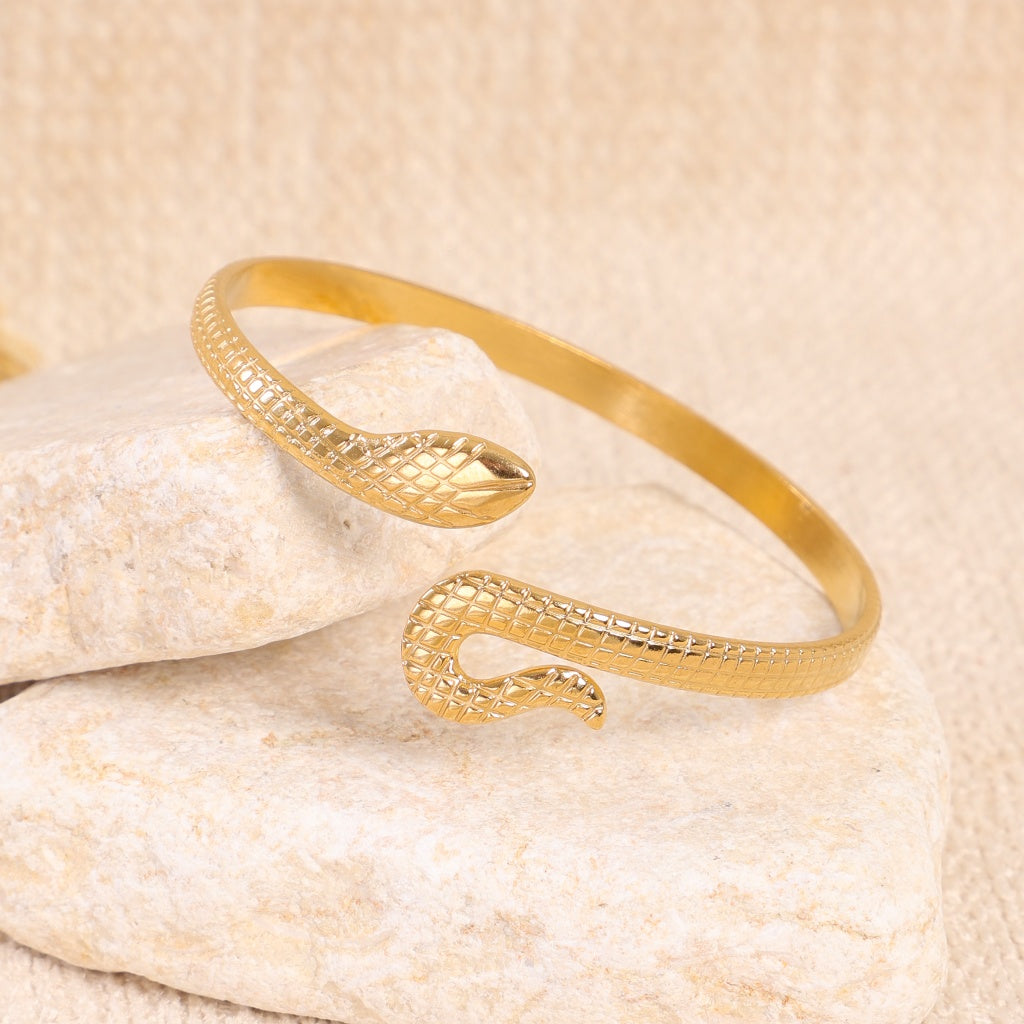 أضيفي لمسة من الغموض والقوة إلى معصمك مع هذا السوار الذهبي الفريد. بتصميمه الذي يلتف حول المعصم على شكل أفعى منقوشة بتفاصيل دقيقة، يمنحك هذا السوار مظهراً جريئاً ومهيباً. إنه قطعة مجوهرات مميزة تعكس شخصية قوية ومحبة للتميز.
