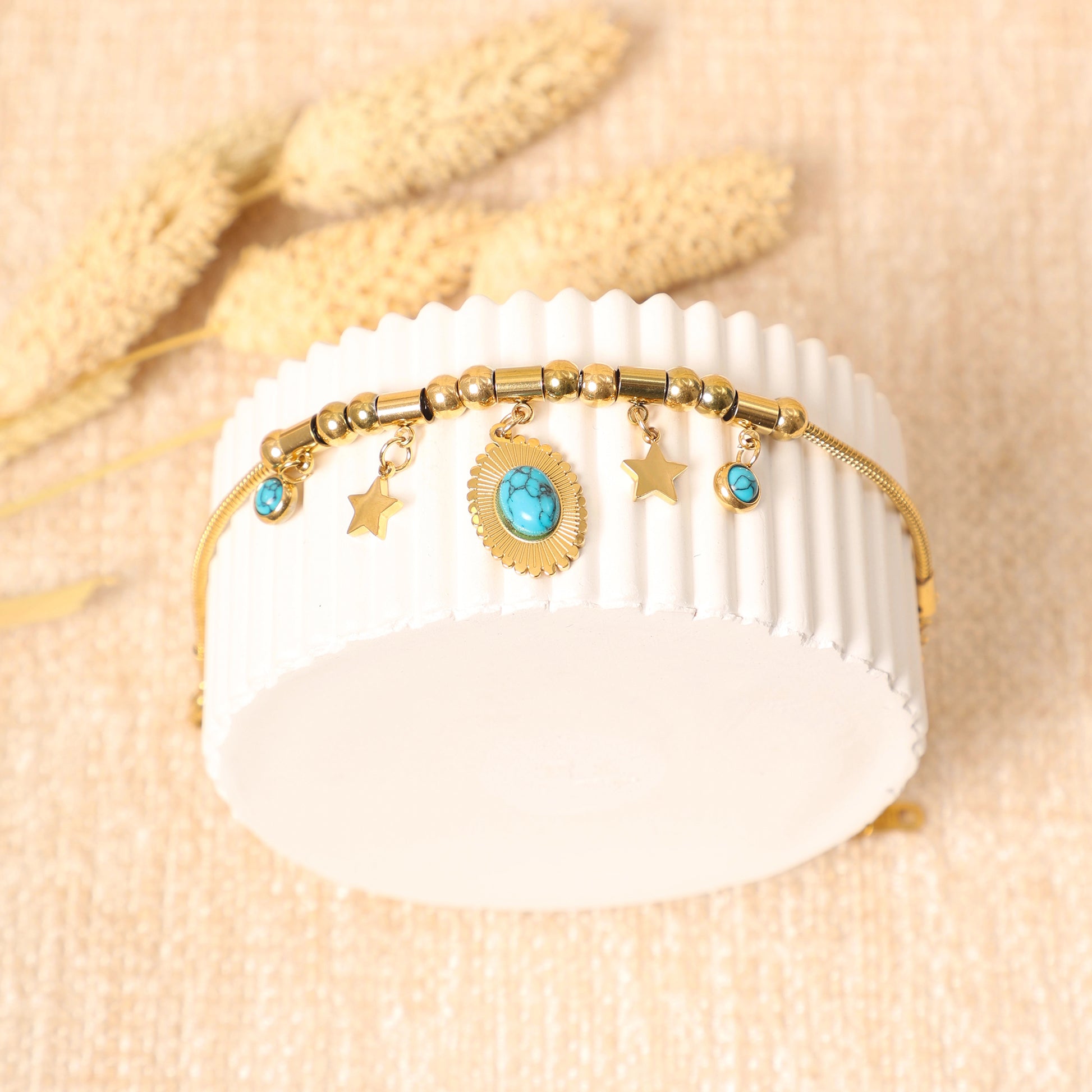 أضيفي لمسة من الألوان الصيفية النابضة بالحياة إلى معصمك مع هذا الانسيال الفريد. يتميز بتصميمه الذي يجمع بين حبيبات ذهبية متراصة وقلادات متدلية من النجوم الصغيرة وحجر الفيروز الساحر، مما يمنحه مظهراً بوهيمياً أنيقاً. هذا التنوع في العناصر يجعله قطعة مميزة تعكس شخصية حرة ومحبة للمغامرة.