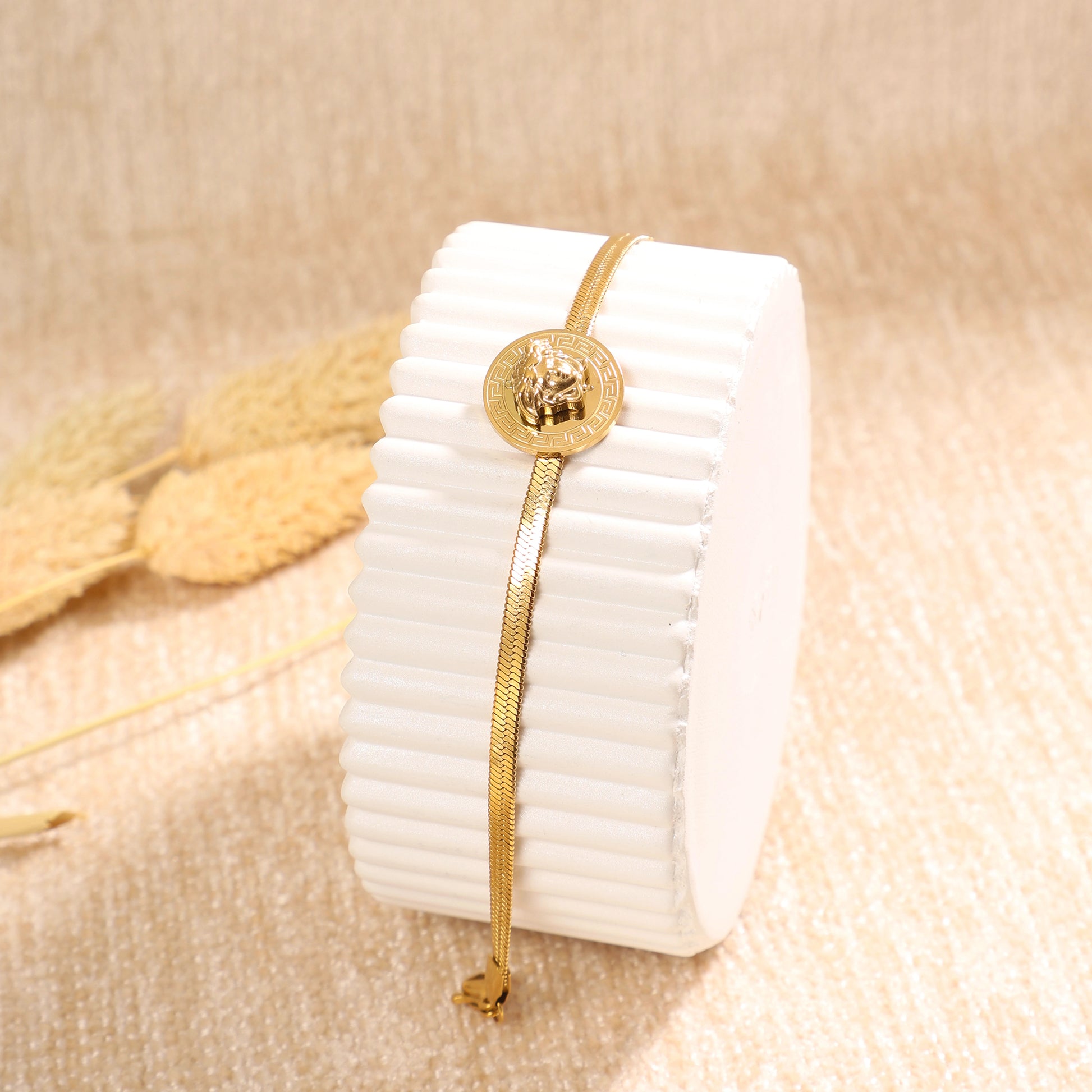 أضيفي لمسة من الفخامة والقوة إلى معصمك مع هذا الانسيال المستوحى من علامة فيرساتشي الشهيرة. يتميز بتصميمه الذي يجمع بين سلسلة ناعمة ومسطحة، وقلادة دائرية بارزة تحمل رسم ميدوسا الأسطوري، وهو الرمز الأيقوني للعلامة. هذا التصميم يمنحه مظهراً جريئاً وراقياً في آن واحد.