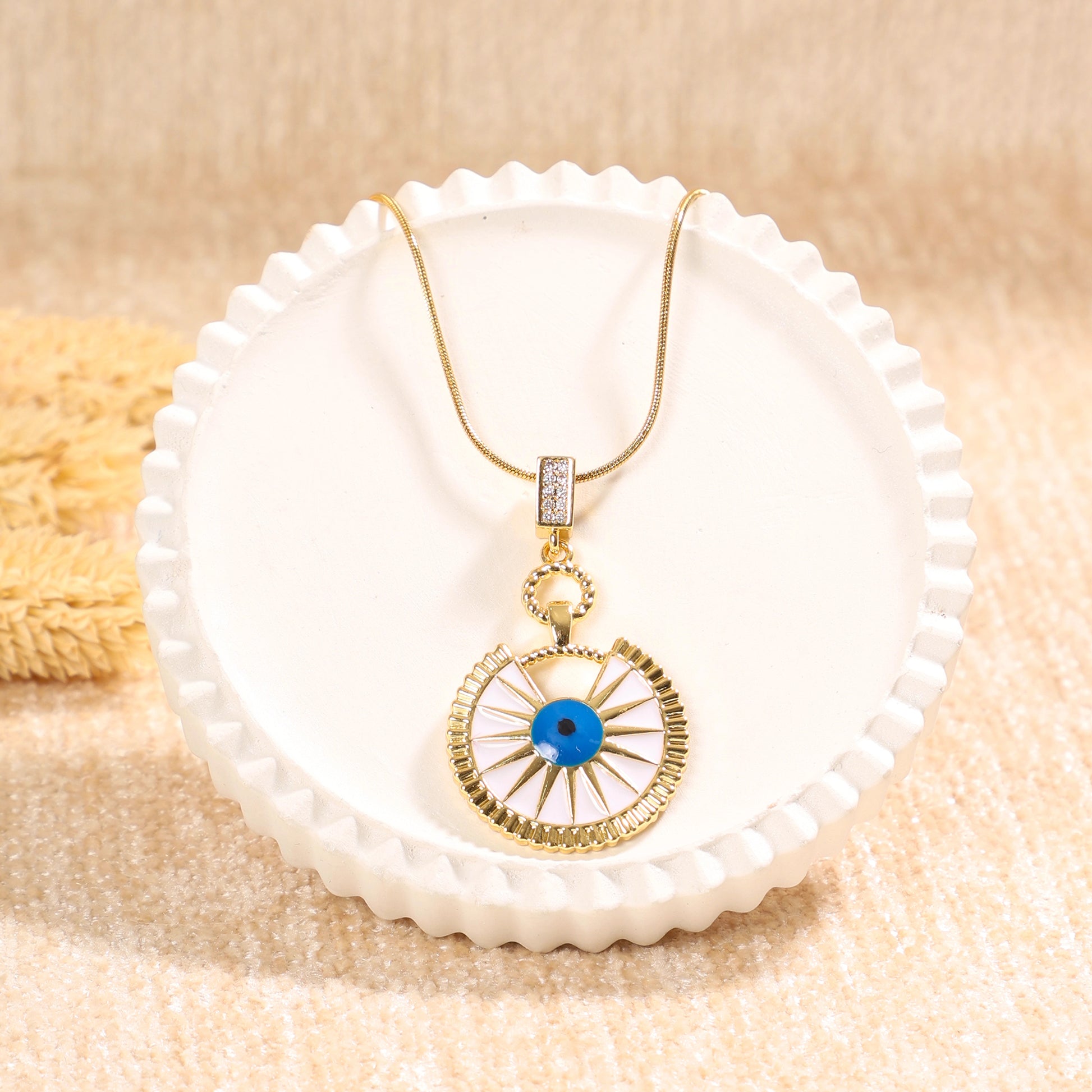 أضيفي لمسة من الحماية والأناقة إلى إطلالتك مع هذا العقد المميز. يتميز بتصميمه الدائري الفريد الذي يجمع بين الجمال الرمزي لعين الحسد والطابع العصري. تتوسط العقد عين زرقاء بارزة، محاطة بتفاصيل دقيقة على شكل أشعة بيضاء، لتضفي عليه مظهراً فريداً. كما تتزين القطعة العلوية بلمسة من الكريستال اللامع الذي يزيد من بريق العقد.