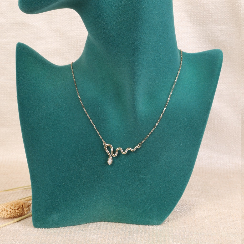 أضيفي لمسة من الأناقة العصرية إلى إطلالتك مع هذا العقد الفضي الفريد. يتميز بتصميمه الذي يجسد أفعى ملتفة بأسلوب ناعم وانسيابي، مع رأس مرصع بفص كريستال لامع يضيف إليه بريقاً ساحراً. هذه القلادة هي قطعة مثالية تعبر عن شخصيتك القوية والمميزة.